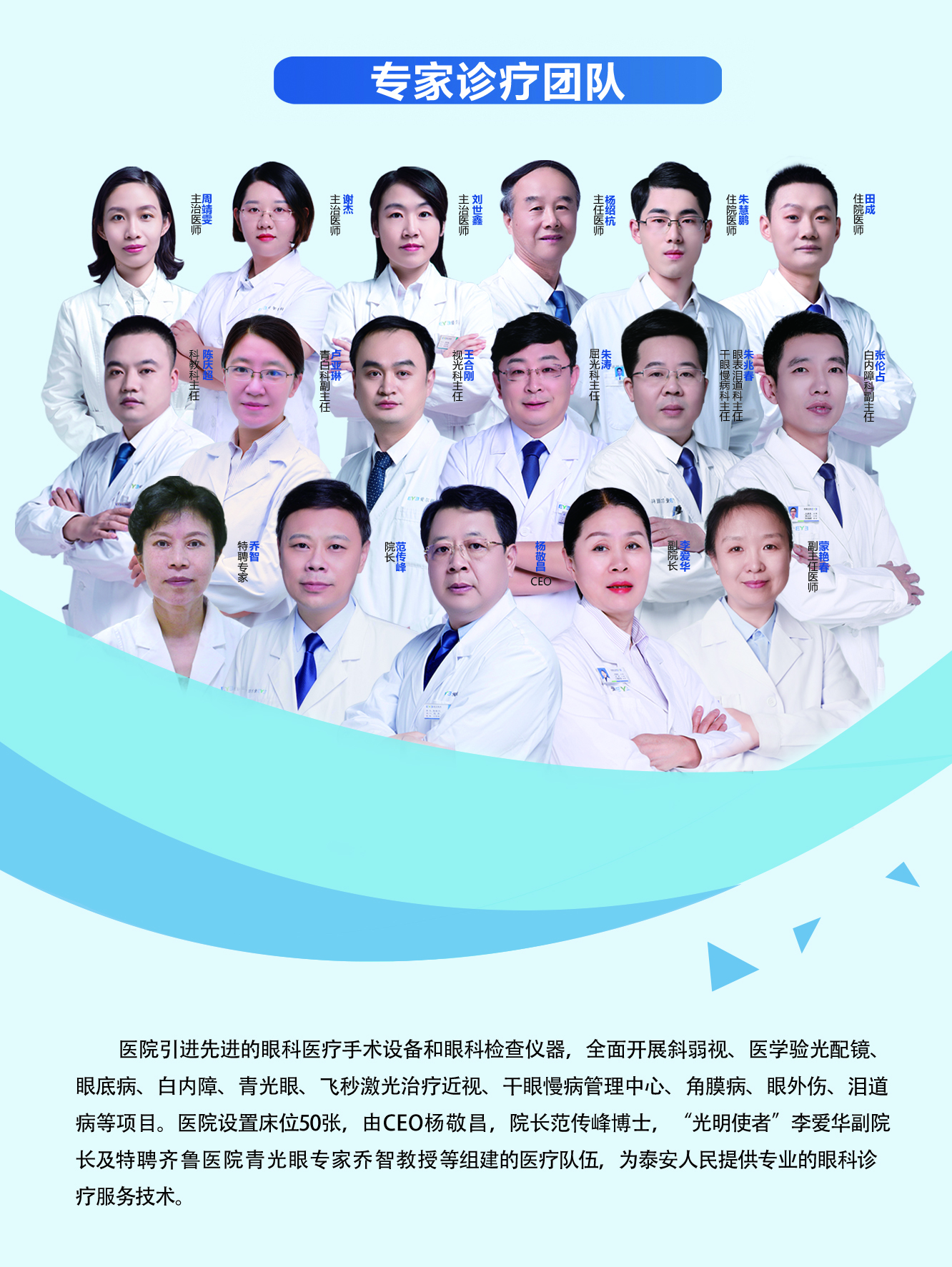 ? ? ?醫(yī)院具備良好的人才梯隊建設體系,眼科專家團隊經(jīng)驗豐富,技術精湛,目前醫(yī)院眼科中高級職稱三十余人,眼科業(yè)務工作總量位居全市前列。由院長范傳峰博士、“光明使者”李愛華副院長及特聘齊魯醫(yī)院青光眼專家喬智教授等組建的醫(yī)療隊伍,為泰安人民提供專業(yè)的眼科診療服務。
